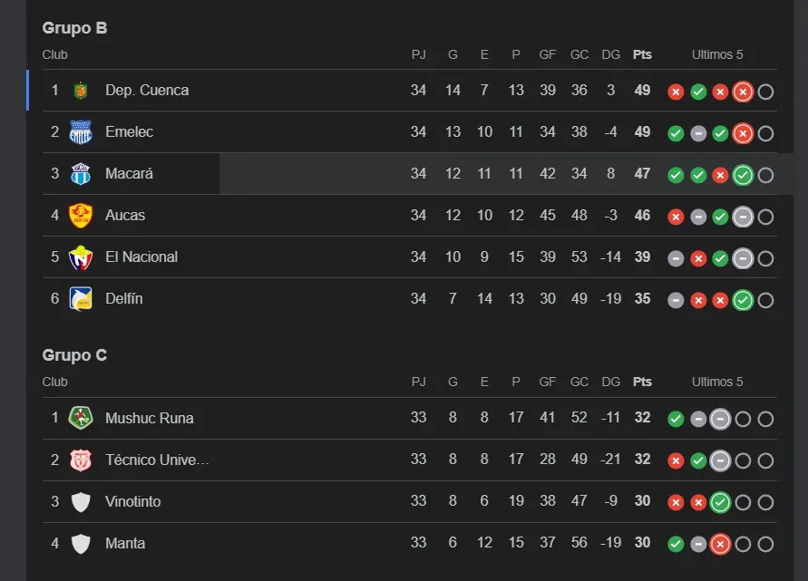 - Mushuc Runa y Técnico Universitario tienen 32 puntos en la parte baja de la tabla.