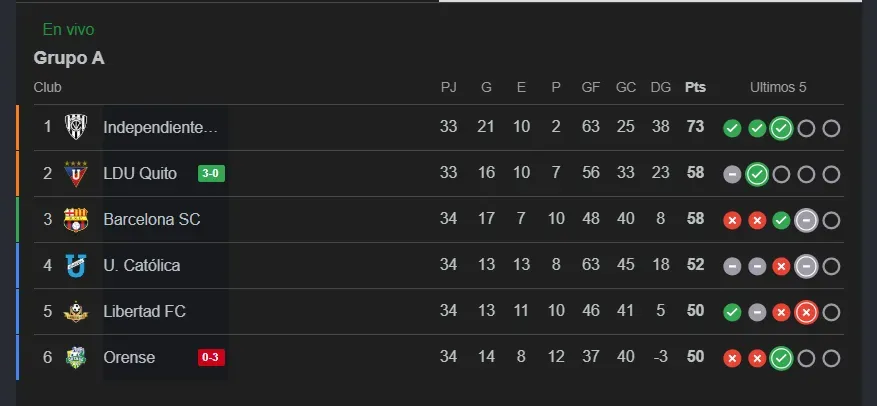 Sigue a Bolavip en Google!Se cerró la fecha 4 del hexagonal del título con el partido entre Liga de Quito y Orense y hay cambios en la parte alta de la tabla. De igual forma en el hexagonal de Sudamericana la pelea se agranda a más competidores.