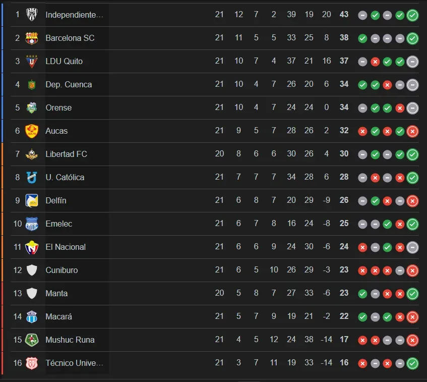 La fecha 20 de la LigaPro se jugó casi en su totalidad este fin de semana y hay cambios en la tabla de posiciones. Independiente del Valle mantuvo la cima, mientras que Barcelona SC volvió a ponerse como escolta.