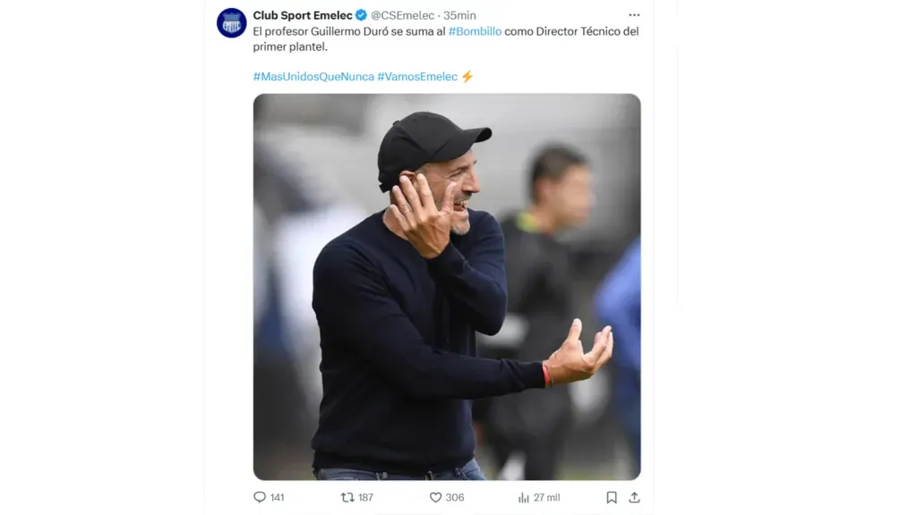 En su cuenta oficial de X, Emelec confirmó que su nuevo entrenador para terminar esta temporada es el DT argentino, Guillermo Duró. El estratega dejó Deportivo Garcilaso en la última temporada y ahora regresa a Ecuador para dirigir a un grande.