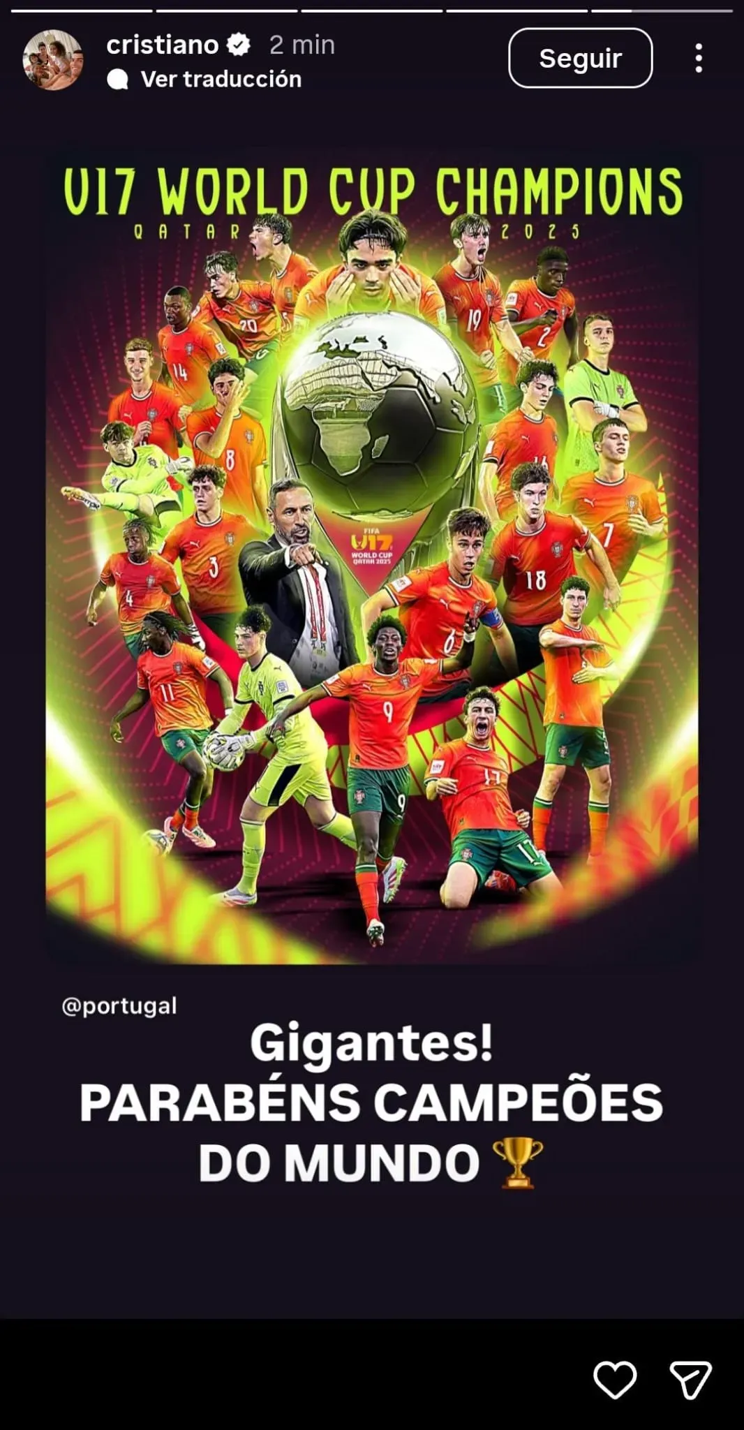 ”Gigantes. Felicidades, Campeones del Mundo”, escribió el futbolista del Al Nassr de la Liga Pro Saudí en su cuenta de Instagram, apenas se consumó el triunfo del combinado Bino Maçaes, en lo que, en definitiva, se trató de la tercera consagración global del combinado luso en toda su historia.