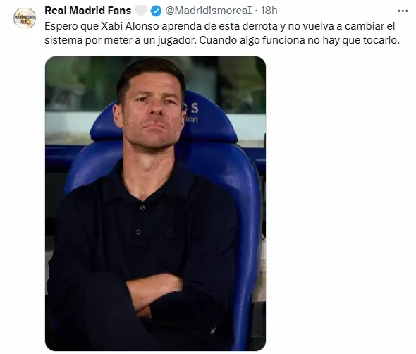 Por su parte, los aficionados hicieron su descargo en redes sociales. Incluso para Xabi Alonso, a quien le recriminaron por el cambio de nombres en el once inicial. ”Espero que aprenda de esta derrota y no vuelva a cambiar el sistema por meter a un jugador. Cuando algo funciona no hay que tocarlo”, se pudo leer en un tuit del usuario Real Madrid Fans.