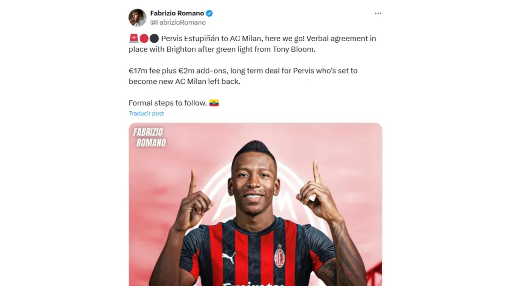 Según reveló Fabrizio Romano, Pervis Estupiñán se convierte en nuevo jugador del AC Milan a cambio de más de 17 millones de euros más 2 millones en complentos. Esto dejaría la compra de Pervis por el gigante italiano en 19 millones de euros.